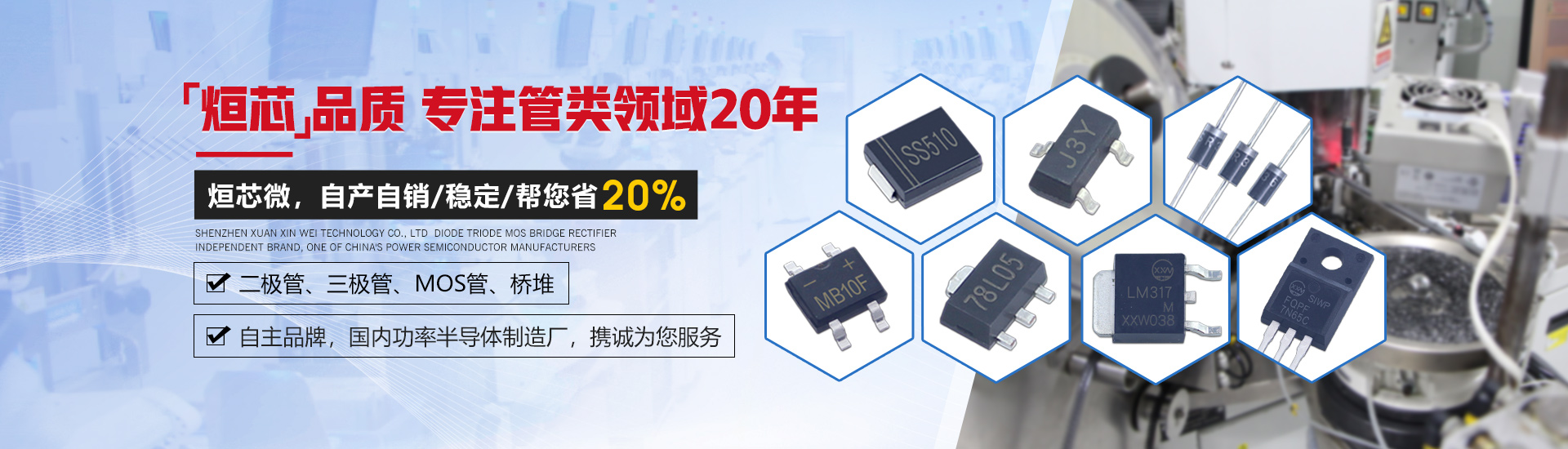 深圳市烜芯微科技有限公司是一家集研發(fā)、生產(chǎn)、銷售于一體,專注于二極管、三極管,MOS管、橋堆等功率半導(dǎo)體領(lǐng)域發(fā)展的企業(yè)。采用國際領(lǐng)先的GPP芯片生產(chǎn)工藝及一心多Die高精密制造工藝,擁有功率半導(dǎo)體器件工程實(shí)驗(yàn)室,全自動(dòng)高精密生產(chǎn)設(shè)備,產(chǎn)品層層把控,全程可追溯,保障了每只產(chǎn)品的卓越品質(zhì)。 產(chǎn)品封裝包括SMA,SMAF,SMB,SMBF,SMC,SOD-123,SOD-123FL,SOD-323,SOD-323FL,SOD-523,SOD-723,SOT-23,SOT-89,SOT23-3L,SOT23-5L,SOT23-6L,SOT-223,SOT-523,SOT-723,DO-41,DO-15,DO-27,DO-35,R-1,R-6,LL-34,LL-41,TO-277,TO-92,TO-92S,TO-92L,TO-126,TO-251,TO-252,TO-262,TO-263,TO-220,TO-220F,TO-247,TO-3P,TO-264,MBS,MBF,MBM,ABS,UMB,UMSB,DB,DBS,D3K,KBP,GBP,GBU,GBL,GBJ,KBL,KBU,KBJ,KBPC,KBPC6,KBPC8,KBPC-W,DNF,TSSOP-8,TSSOP-16,SOP-4,SOP-6,SOP-8,SOP-10,SOP-14,SOP-16,DIP-4,DIP-6,DIP-8,DIP-10,DIP-14,DIP-16,月產(chǎn)各封裝達(dá)6億只。 公司通過了ISO14001環(huán)境管理體系認(rèn)證,產(chǎn)品均獲得了ISO9001質(zhì)量體系認(rèn)證、UL、SGS等認(rèn)證,符合歐盟最新RoHs指令。擁有和致力于烜芯微/XXW自主品牌產(chǎn)品的推廣,提供技術(shù)支持,選型替換,cost down方案及擁有專業(yè)的生產(chǎn)管理團(tuán)隊(duì)和銷售團(tuán)隊(duì),保證了供貨穩(wěn)定及售前選型服務(wù)等問題。 公司產(chǎn)品廣泛應(yīng)用于開關(guān)電源、適配器、逆變器、控制器、汽車電子、家用電器、通訊設(shè)備、無線充、鋰電池保護(hù)板、驅(qū)動(dòng)電機(jī)、安防警報(bào)、太陽能光伏產(chǎn)業(yè)等多個(gè)領(lǐng)域。取得了國內(nèi)外眾多品牌大廠的認(rèn)可與合作,我們將堅(jiān)持奉行“烜芯品質(zhì),誠信經(jīng)營,合作共贏”為公司經(jīng)營理念!竭誠為新老客戶提供優(yōu)質(zhì)的產(chǎn)品及服務(wù)。